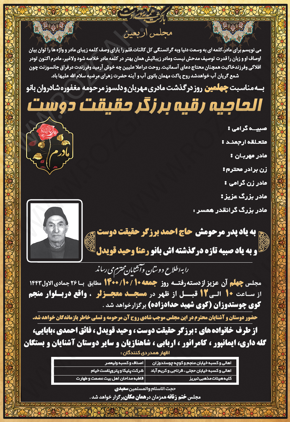 در لحظات تلخ فقدان عزیزان، آنچه آرامش میبخشد، یاد و احترام به مقام متوفی است. قالب آماده اعلامیه ترحیم رزگاه، با طراحی زیبا، رسمی و متناسب با فرهنگ ایرانی، به شما کمک میکند تا در کوتاهترین زمان، اعلامیههای ترحیم، یادبود و چهلم را با کیفیت بالا و ظاهری محترمانه آماده کنید.